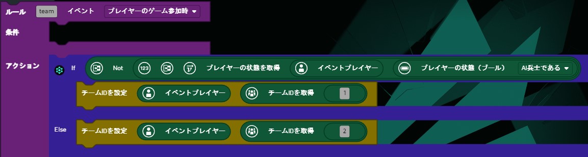 ゲーム参加時にプレイヤーをチーム1、AIをチーム2に設定するルール。次のマップに移動したときも実行されるはず。