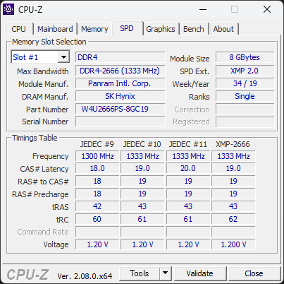 CPU-Zのメモリ情報(W4U2666PS-8GC19)