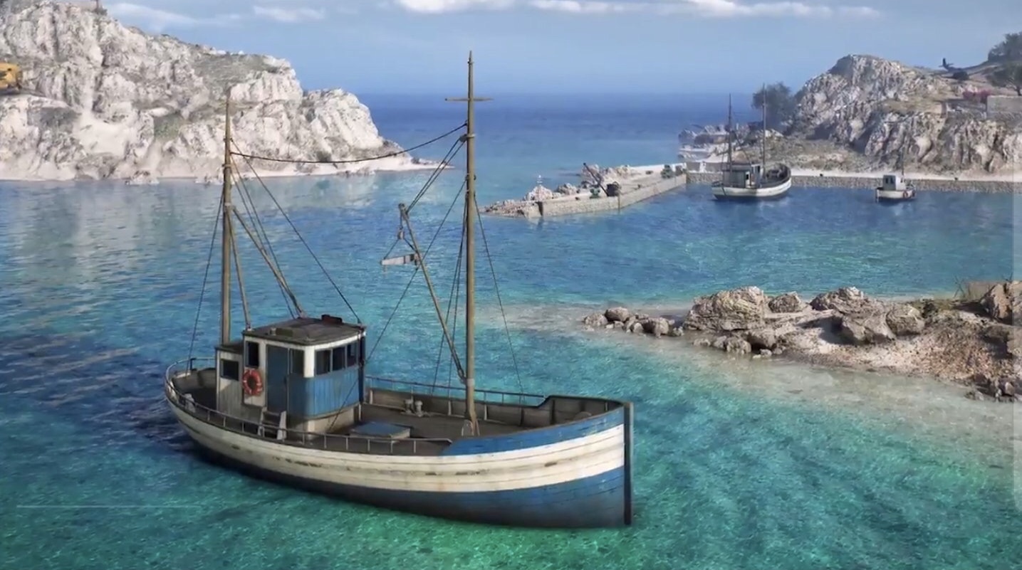 ギリシャマップのスクリーンショット。掲示板に上げると画質が劣化してしまうかもしれないけど、海がとても綺麗。…よく考えたらBFVの今のどのマップも海を泳げるエリアが無いような気がする。Twisted Steel は泳げても沼だし…。