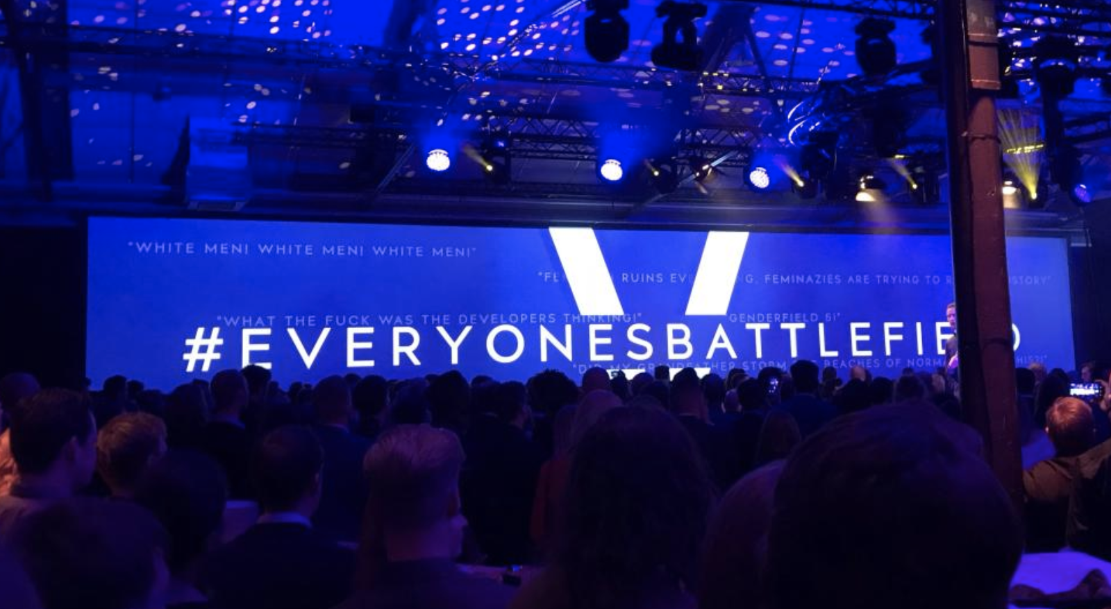 [[URL>https://www.gamerevolution.com/news/464567-battlefield-5-launch-party-criticisms]] BFV発売を祝うパーティのスクリーンに注目、#EveryonesBattlefieldの周りに描かれているのはユーザーからの「Genderfield 5!」「フェミニズムはすべてを台無しにし、フェミニズムは歴史を書き換えようとしている」「開発者は何を考えていたのでしょう!」「白人男性!白人男性!白人男性!」といった批判コメント 一部の過激なコメントを取り上げて大多数のユーザーを煽るのはソダーランド並の愚行