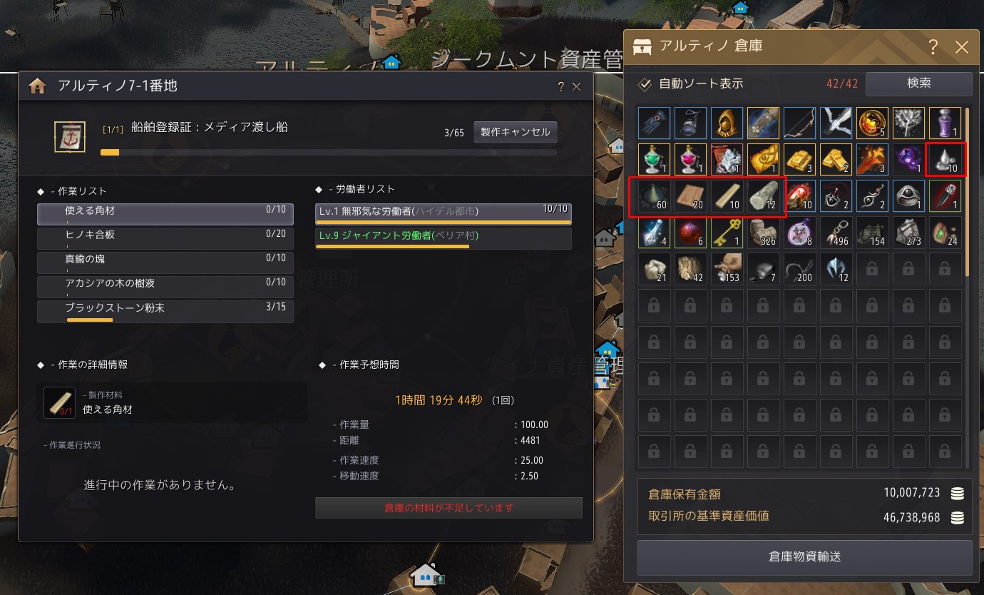 メディア渡し船が途中から作業できなくなりました。倉庫に材料は全てあります。労働者もいますし、宿泊施設も作りました。なのに、倉庫の材料が不足しています。と表示され進行できません。どうしてでしょうか?