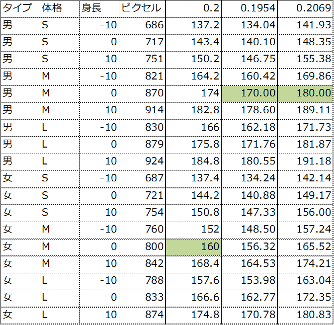 とりあえず身長の推測おいとく。緑色が基準にした値。