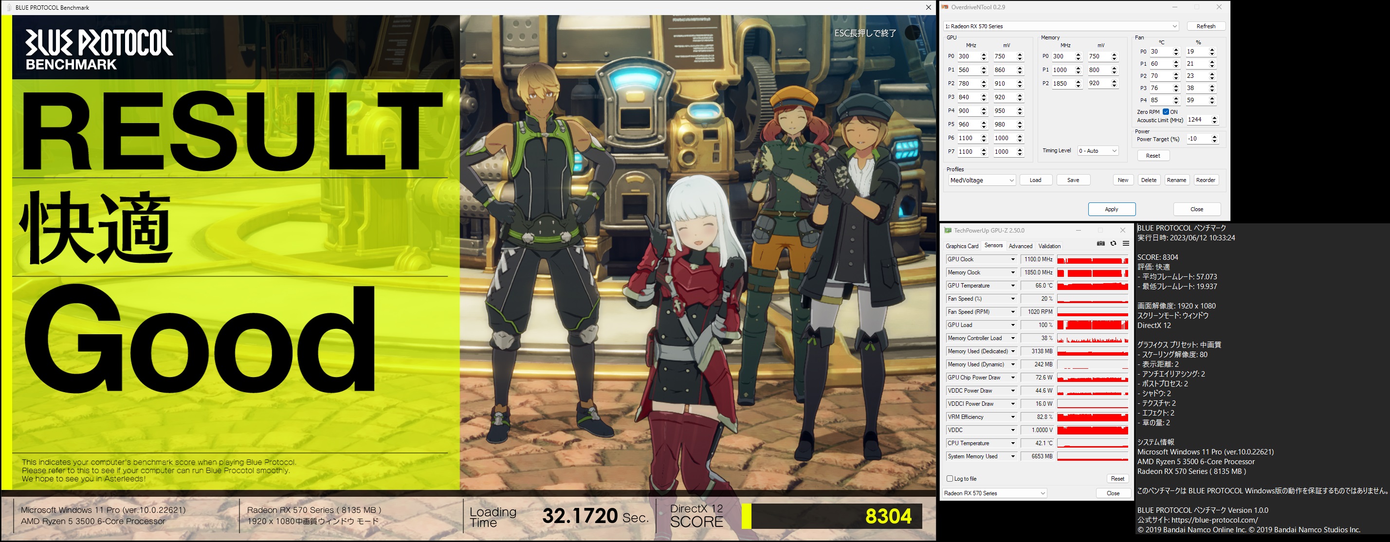 Radeon RX570 (1100/1850MHz)、1920x1080 「中」 (80-2-2-2-2-2-2-2)、 スコア8304 (57.073fps)