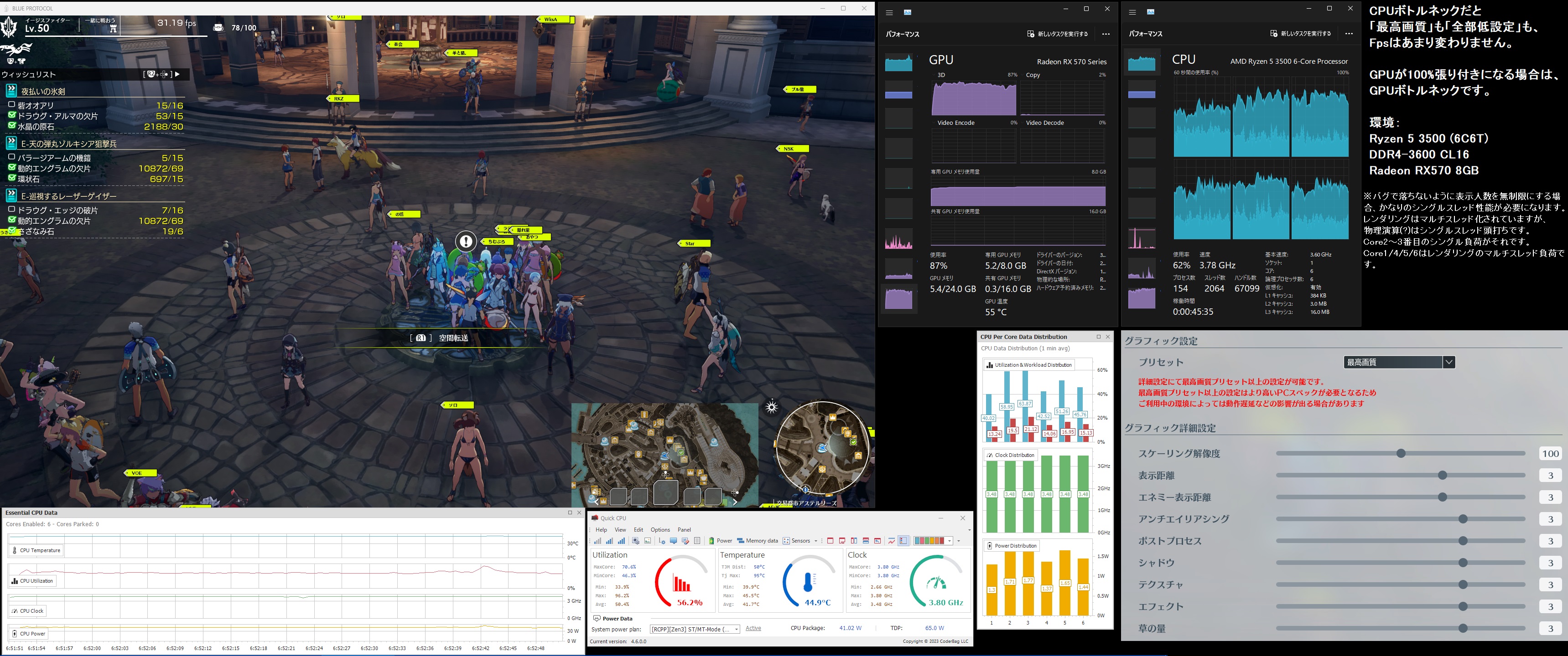 CPUボトルネックテスト、表示人数無制限、最高画質設定、1920x1080、Ryzen 5 3500 + RX570。