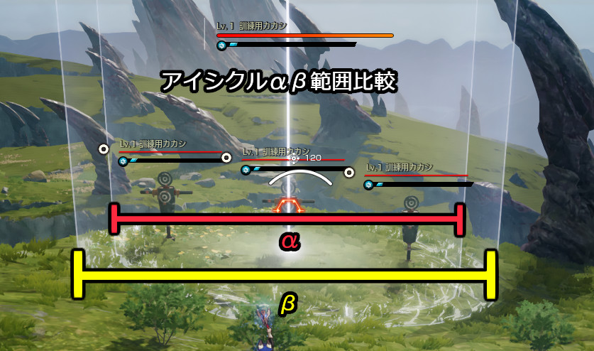 アイシクルの範囲比較画像作ってみた。初めてのソフト使ったのとセンス無いのとでクソ下手編集だけど許して。雰囲気だけ感じて。 αとβでは範囲拡大のβの方が使いやすいと思う。面制圧力は勿論、範囲広くなるのでパッドでのロックオン無しの手動エイムもしやすい。上級産屋で大分活躍してる。 アイスシャードβの攻撃力ダウンは移動速度ダウンと同じ秒数持続してカカシ相手に約10秒持続(目視ガバ計測