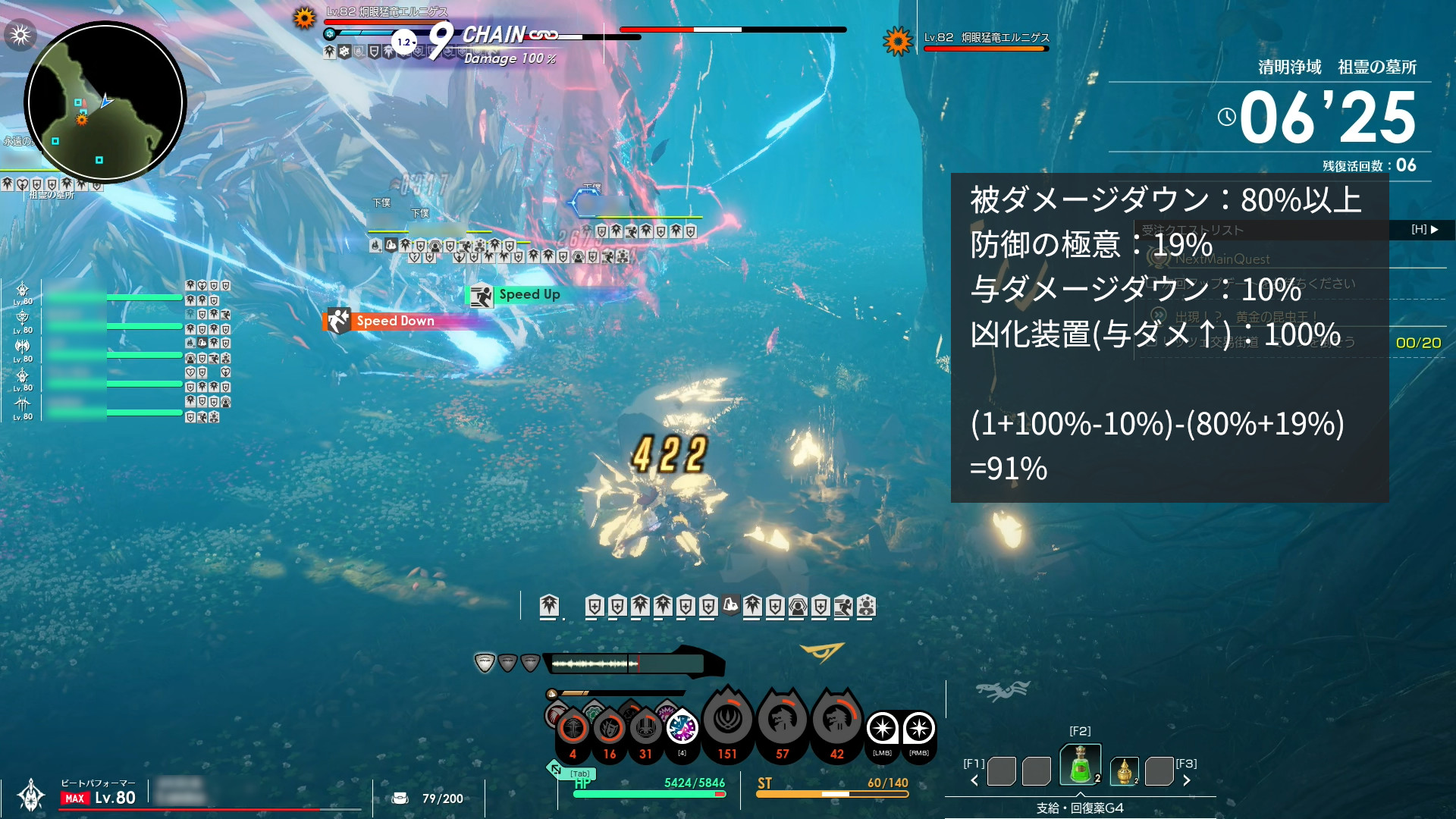 ボスでも試してみました。バフは80%以上、防御の極意+19%、与ダメ-10%(多分アイスシャード)、最初の凶化装置で与ダメ+100%。この状態でダメージエリアに入ると、422~432ダメージ。そして、凶化装置が壊れてから同じダメージエリアに入ると0ダメージ。ここから分かるのは、「ダメージエリアはダメージを与えた瞬間の補正でダメージ計算する」、「凶化装置がある状態で0ダメージは観測できなかった」ということです。あと、画像なら名前の処理が簡単だったので提出しておきます。