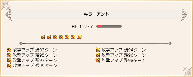 そもそもキラーアントの攻撃アップ残99ターンってどういうことなの。これ不具合じゃないんならチートも良いとこだよなー。
