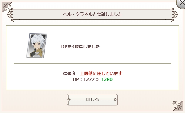追記、信頼度が100%のキャラと出会うことができますが、その場合信頼度の上限に達しています。 信頼度:上限に達しています という表示は見たことがあります。敢えて100%のキャラとチケット使って会話して結果ウィンドウを出してアップしておきますね。