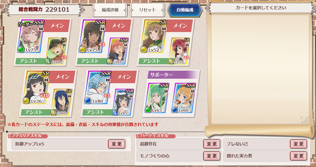 仮想でフィリア編成を組んでみたが総合23万弱。ちょっと育てないといけないな。褒賞でジャガ丸が出るようなら助かるけど、そうでない場合はジャガ丸を狩りに行かなければ。