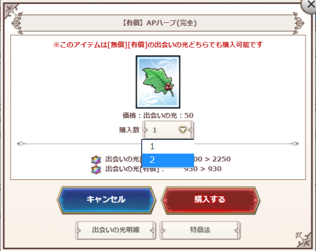 バグだと思うんだが、APを一桁台くらいまで減らすとタブが出て、半額ハーブが2個買える。結果は、通常分の光100を消費するが、回復は完全回復1回分だけ。