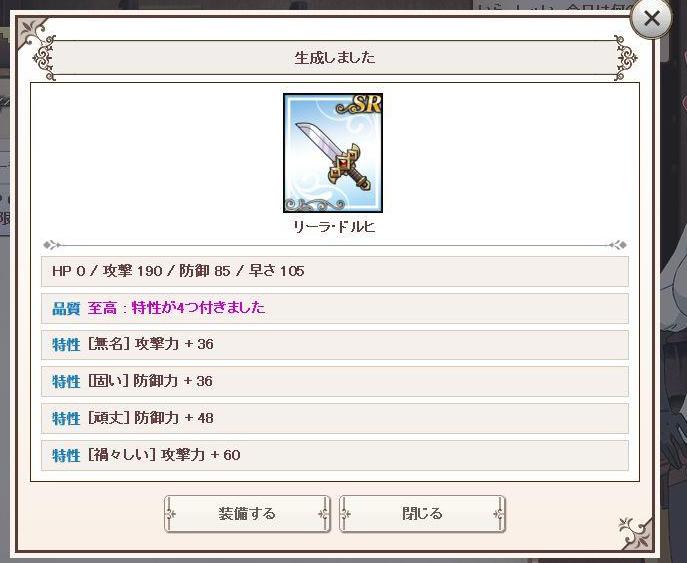 今までいろんなSR武器を累計100本以上作ったけどここまで当たり引いたの初めてだ。 まあステップアップで爆死してSRSSRともに確定分のみ(しかもSSRリューだった)わけだけど。リューが嫌いなわけじゃないけどもね……。