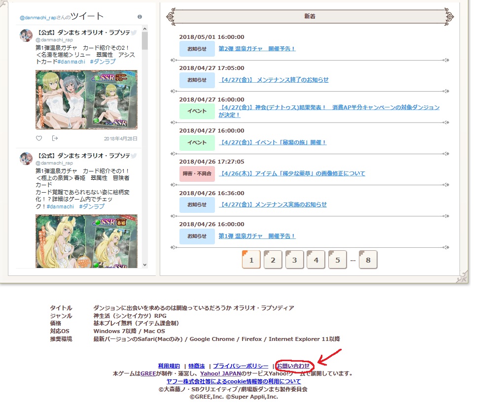 ゲーム画面の下の方に青い文字でお問い合わせと小さくありませんか?そこをクリックすると問い合わせ画面に進みます。