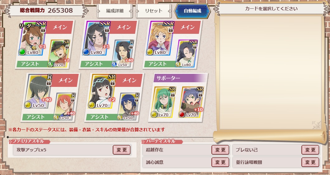 Pro3の攻略は自分もほぼ同じかな。サポはSRリヴェリアとこの前のイベントで獲得したSR赤レオ様。メインとアシスト合計で速さ4600オーバーのキャラで試したけど、どうしても初撃は食らってしまう。初撃を食らっても黄属性なら死ぬことはないし、翠や蒼でもHP30000超えていれば死なない。初撃が終わったらSRレオのバフ3連後スキルで攻撃し、最後にヴェールブレス2回掛け。命のスキル2回でLA発動して終了。構成は以下の通り。