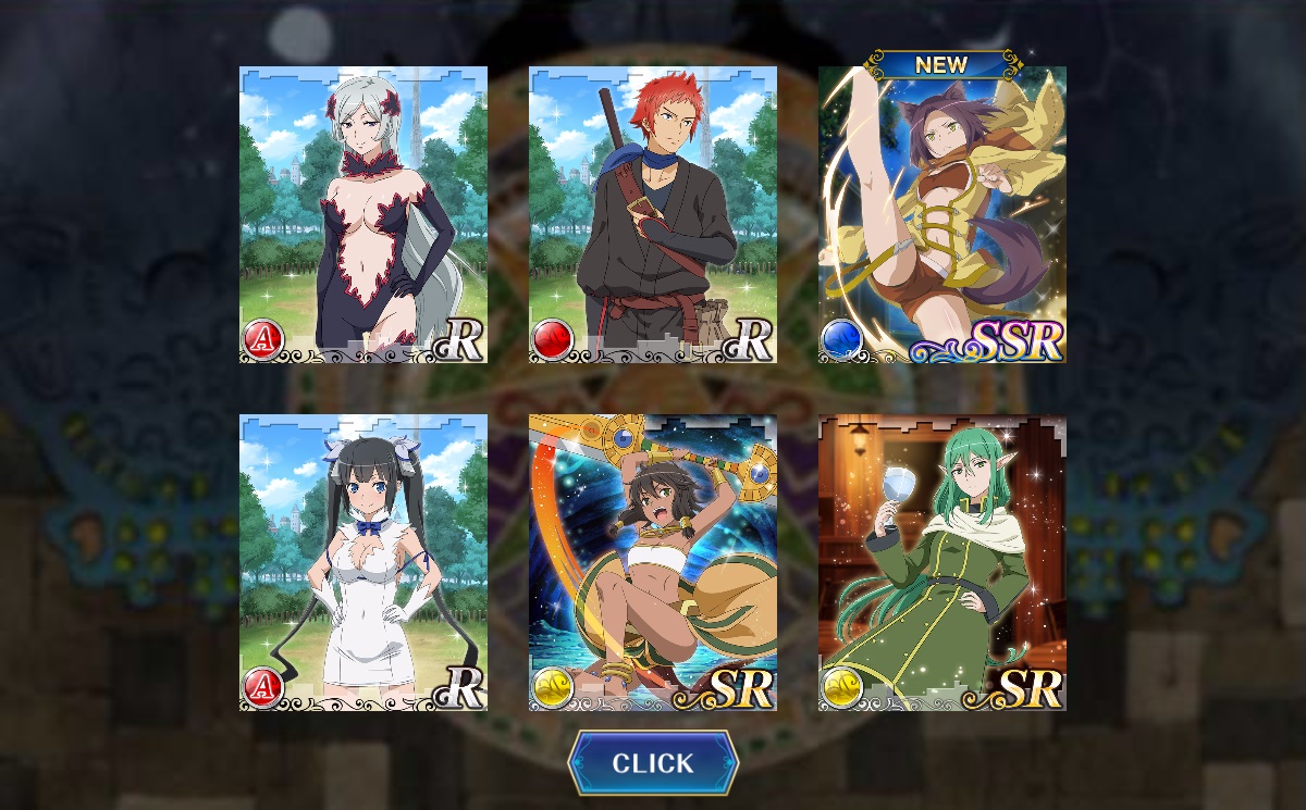 お試しの1回でSSRアスフィの赤、その後R1枚、SRヘスティア青来て、溜まっってたBPポイント消化後の6連でこれな。この青いギタは特攻っぽいな。配布エマすぐに死んでしまうんで取り替えよう。