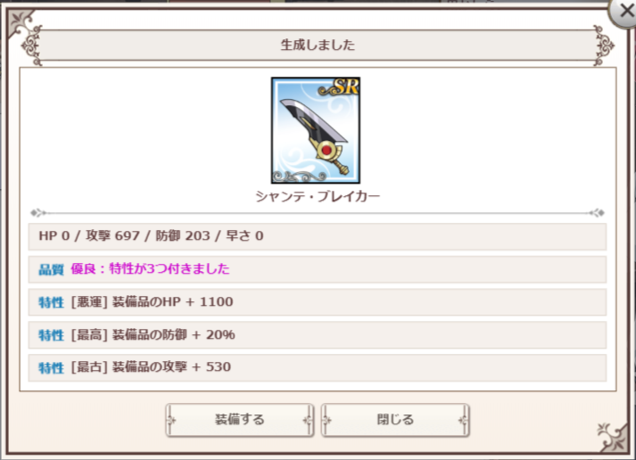 今回のSR武器作成は頑張ってもこの辺が限界なんだが・・・。禍々しいとか出ないなー。