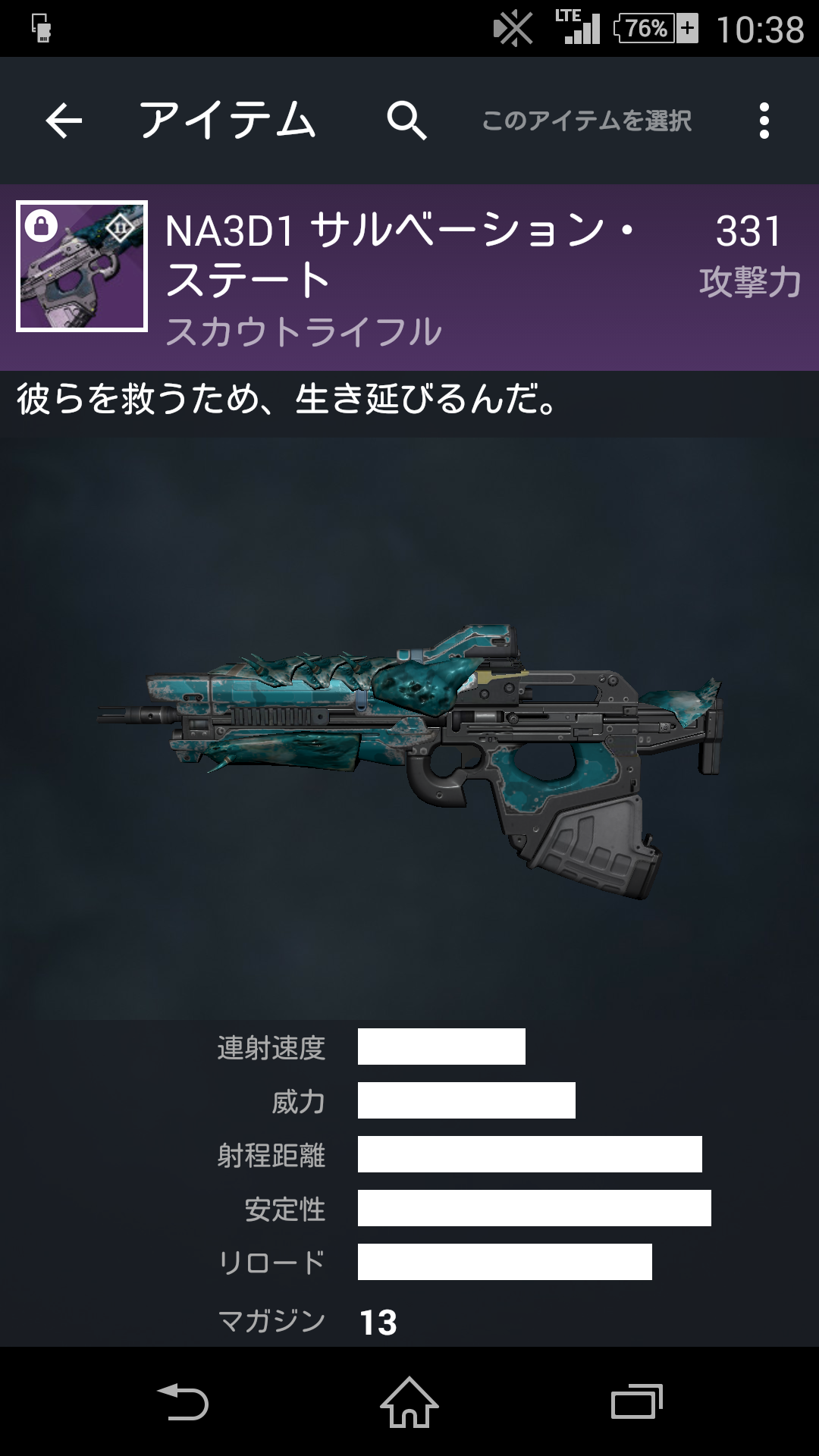 ハウス・オブ・ウルブズによって追加された、新スカウトライフルです。NA3D1 サルベーション・ステートです。PS4が無いためスクショとなりましたが、ご了承下さい。