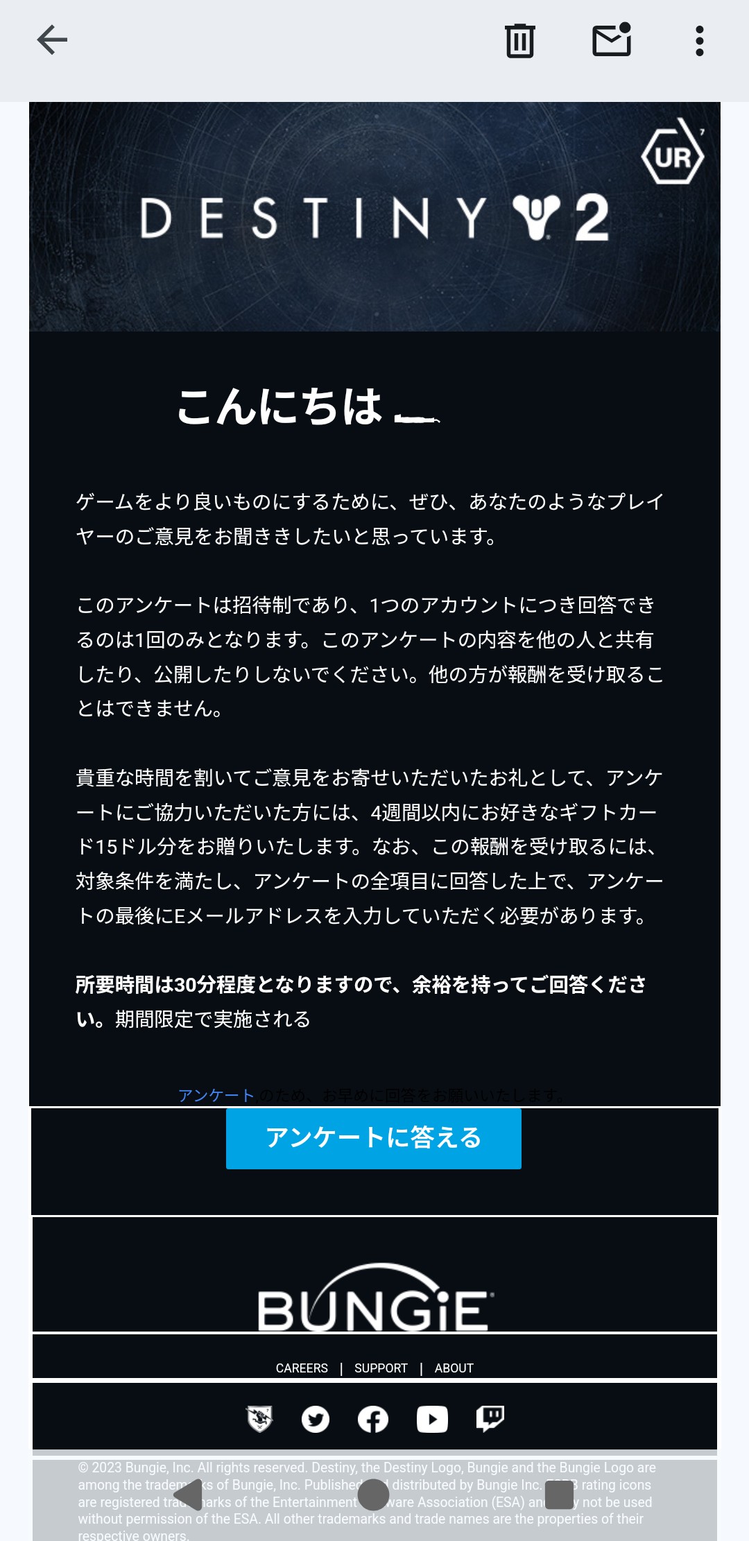 ↑こんなメール。こんにちはの後ろは消しゴムマジックしたけどこのゲームだけで使ってる名前だったしメアドも公式のBungie user researchだったからまず本物のはず…