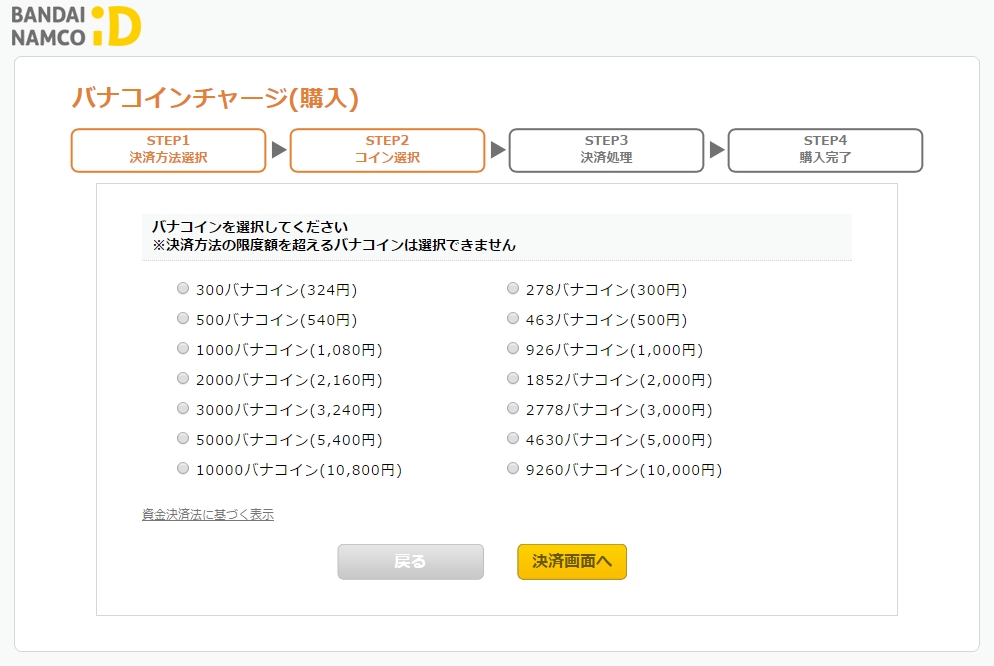 少額決済希望の場合はこのサイトから。 ttps://www.bandainamcoid.com/portal/coinCharge サイトや決済によっては300円がない場合があるので注意