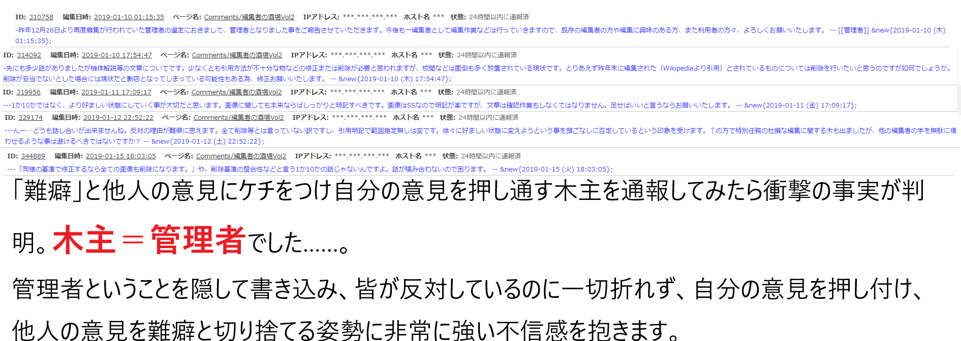 酒場で他人の意見を難癖ということは最低の行為であり指摘しても一切の反省の弁がないので木主を通報しました。上の枝を見てまさかと思い管理者を見てみましたが同じく「通報済み」担っていました。今年に入り初めての通報でしたので、木主=管理者ということが分かってしましました。非常に残念です。尚、再選定についての質問はsWIKI(https://www.swiki.jp/inquiry/ )までと管理者が指示しています。 非常に範囲の広い誘導ですので、管理者についての疑念や問題点を挙げるのも直接でよいと思います。