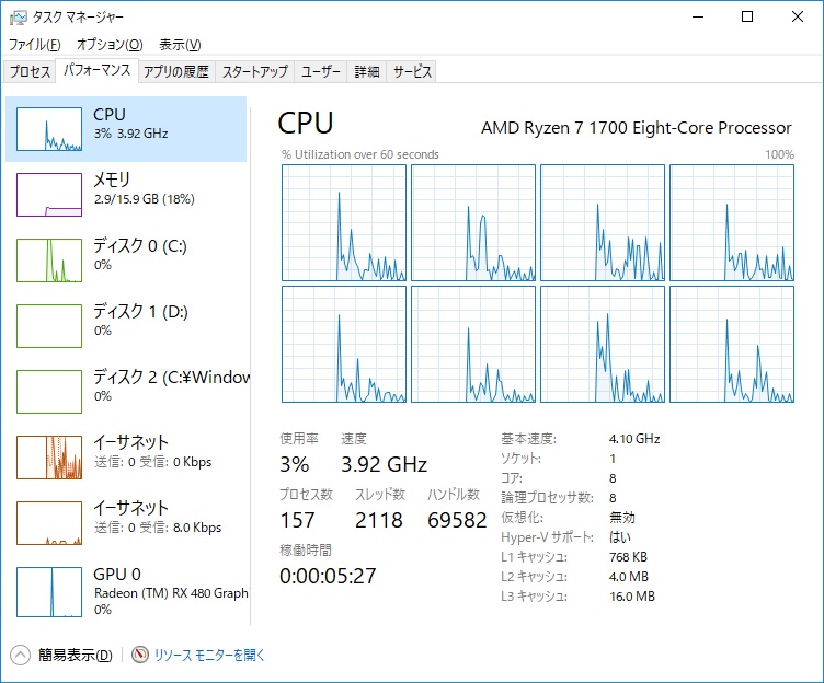 Windows10 Fall Creators Updateのタスクマネージャに事前情報通りにGPU Loadが追加された。