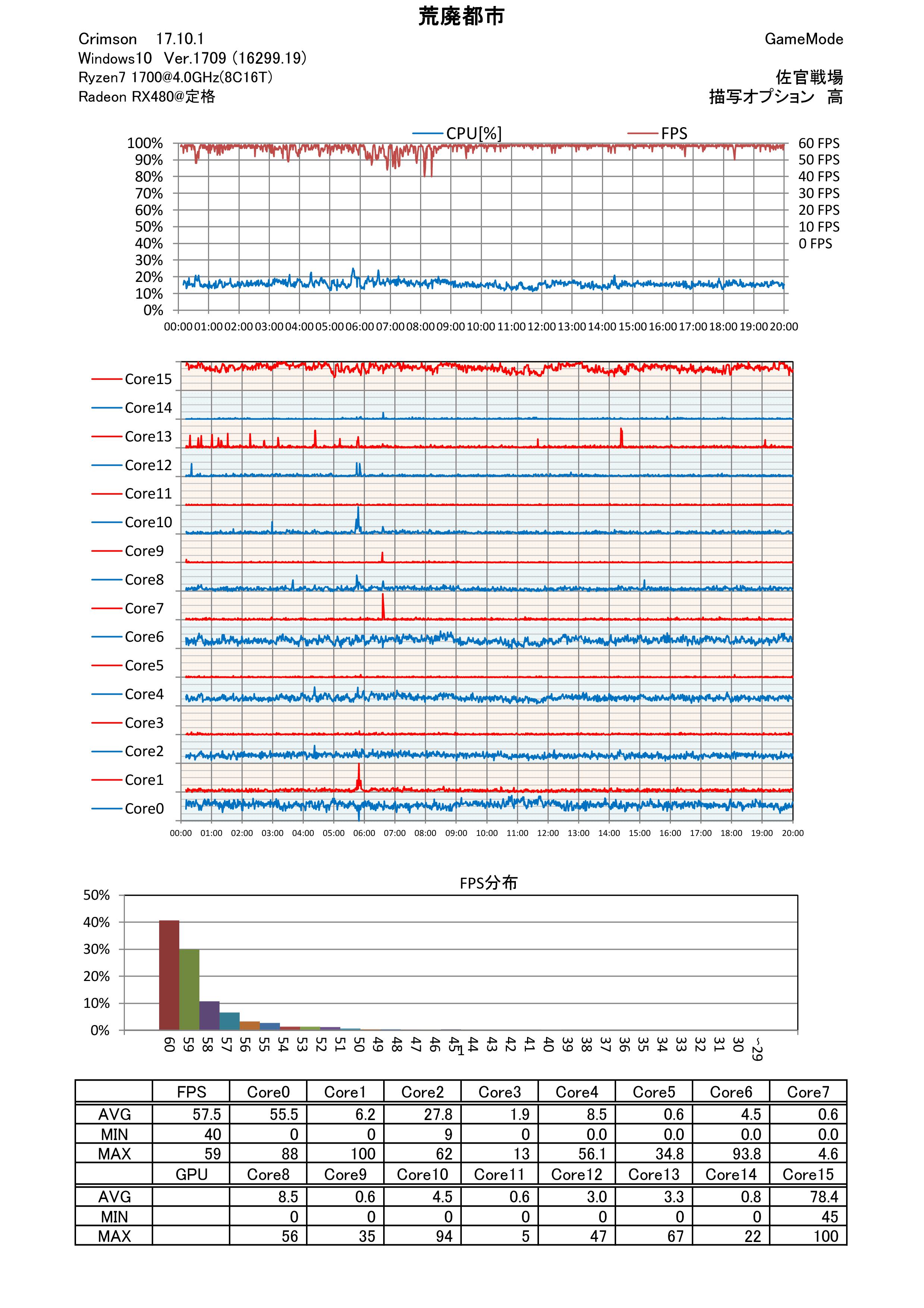 荒廃都市 Ryzen7@4.0GHz 5:49に一瞬だけ高負荷が掛かって、1番コアが止まってます。SMTに負荷が掛かるとメインコアのパフォーマンスが落ちるようです。15番コアに常に負荷が掛かるRyzenはもしかするとガンオンで不利かも知れません。Windowsでのコアの扱いというよりは、プログラム上の問題なのかも知れませんね。