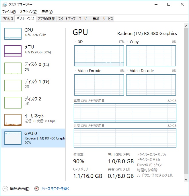 ドライバの更新をしたら「Encode」の使用率が0%になったけれども、GPU使用率は変わらず高い・・・3Dの使用率が2割で他のは0%。何がGPU使ってるんだろう?
