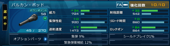 ジェガンのバルカンNに「集弾9%」「シルブレ1%」「緊急弾薬補給12%」つきました