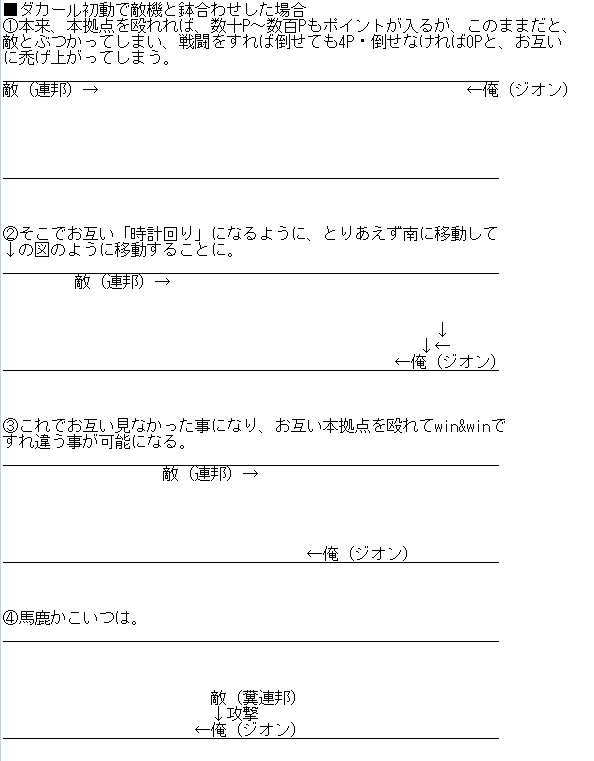 ダカールは初動凸、レースMAPです。初動で防衛するのはマナー違反なので止めましょう。これは紳士協定です。初動での敵機への攻撃(防衛奴除く)、ロックオン、地雷、レーダーは禁止です。これを守らない者は厳しく罰せられます。対処方法としては、ジオに乗ることです。ジオであれば凸火力があり、初動防衛奴に絡まれた際に、最悪早めに覚醒して、制裁を食わえて逆に敵をハゲさせる事ができます。