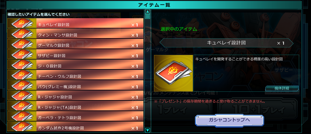 機体コスト320以上の設計図や要請書がラインナップされた「La+ガシャコン」をプレイする為のチケットが入手可能となりました。(金図だけとは言ってません)