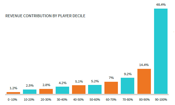 ⬆⬆⬆⬆⬆微課金者と重課金者の収益に対する貢献度合いについて、ガンダムオンラインのデータは公表されてないからないけど、調査会社が調査した結果を記載します。『全課金ユーザーの内、下から10%のユーザーからの収益は全体の1.2%ということです。課金額が最も多い「90-100%」は収益の48.4%を占めています。グラフに書かれていませんが、Swrveによると「90-100%」に属する課金ユーザーは全ユーザーの0.19%しかいないとのこと。つまり、収益の約50%は、全ユーザーのたった0.19%で支えられているということです。』