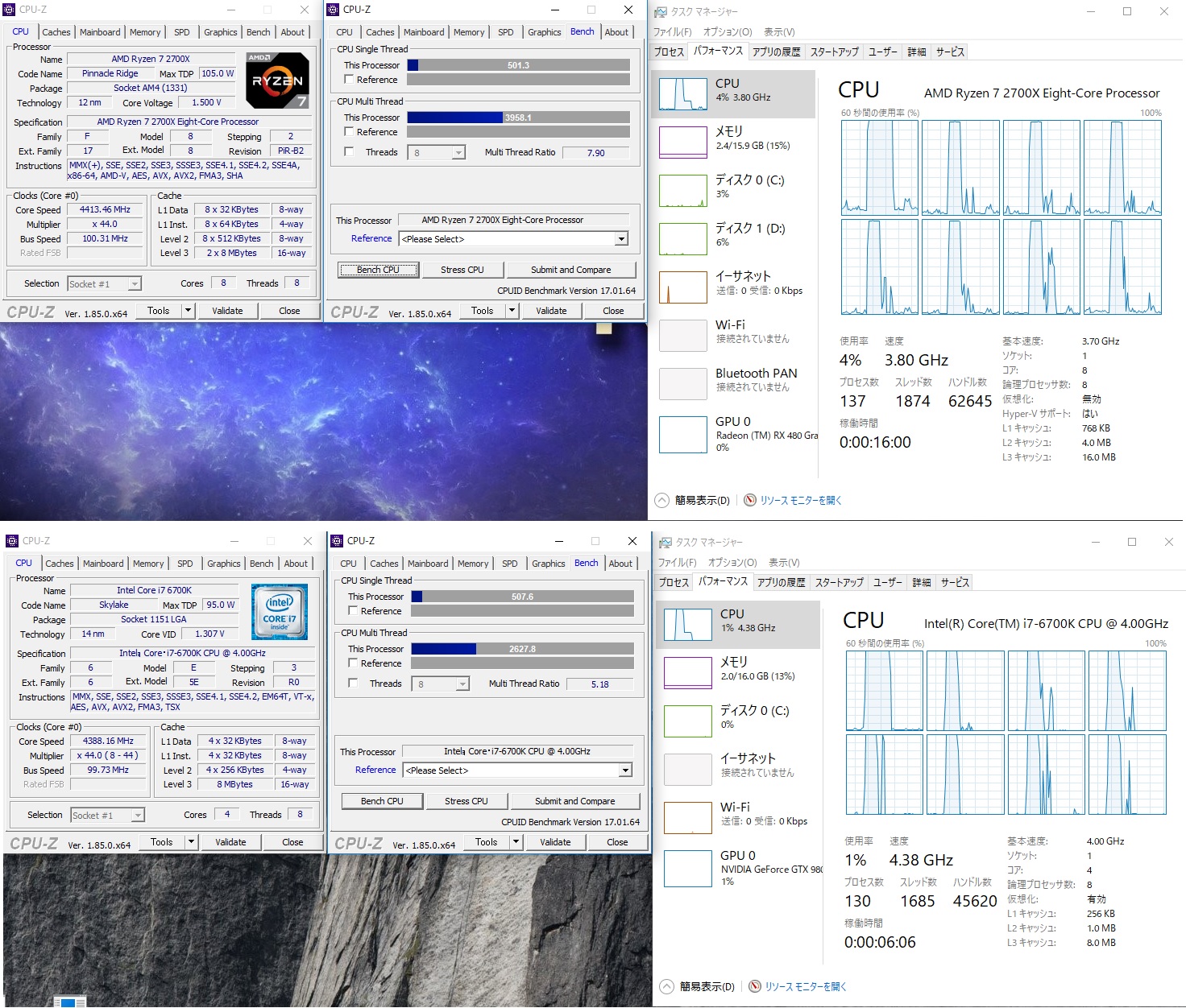 4.4GHzにクロックを合わせたRyzen7 2700 と i7 6700kのCPU-Zベンチマーク結果