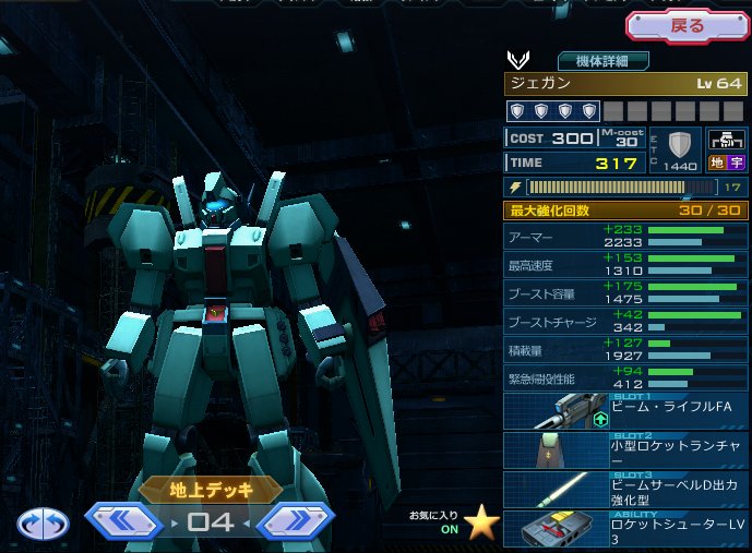 (´・ω・`)フルメカでジェガン叩き直した。始めたばかりの頃にνガンガチャ単発回したらたまたま出た思い出の品だから、これからも第一線で使っていくわよー!