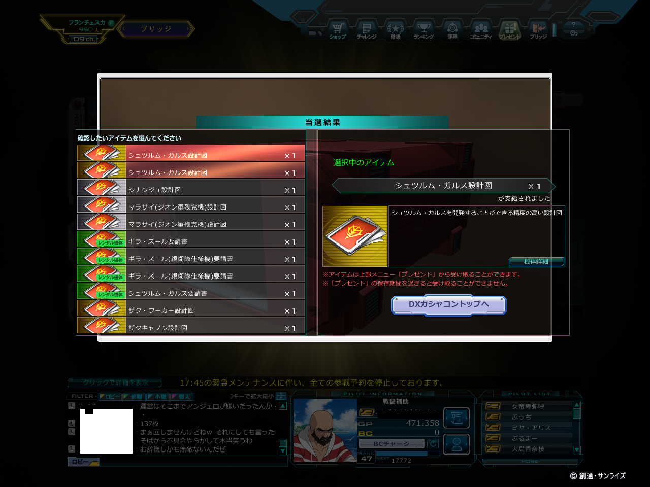 メンテ前になけなしのDX10枚でシナ狙ったる!→虹きたー!!→シュツガルx2「やあ」