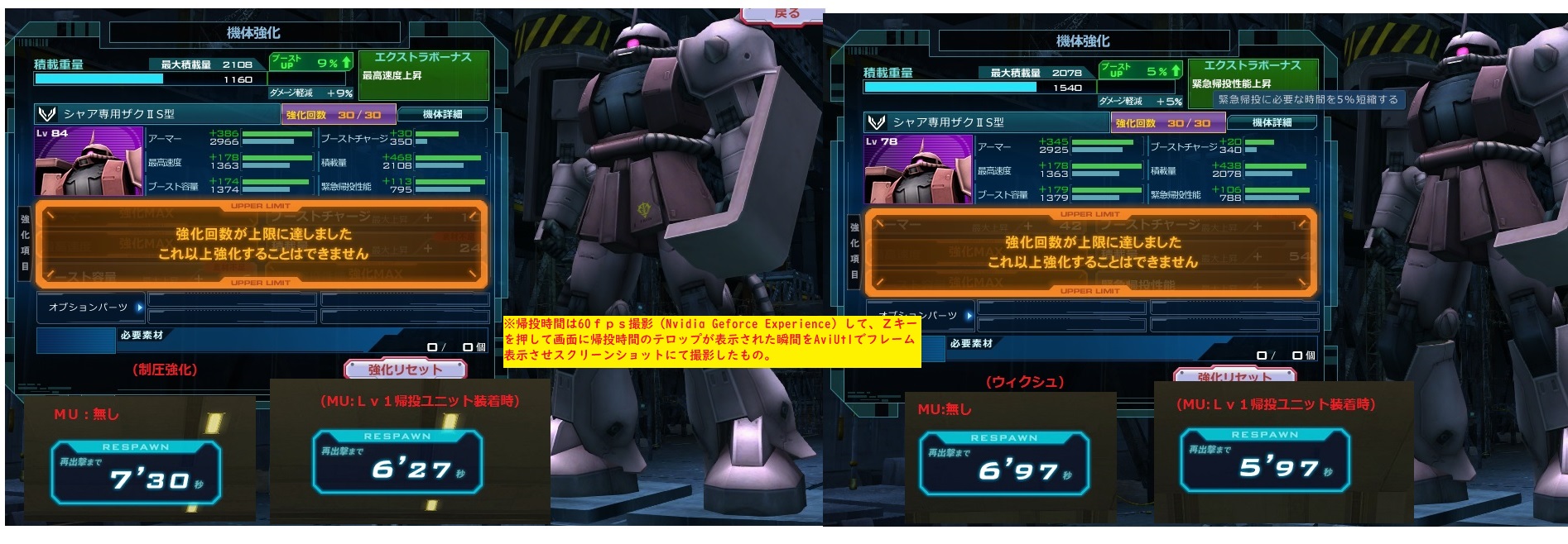 緊急帰投ボーナス有り無しと、MU:Lv1帰投ユニット有り無しの帰投時間をまとめましたので参考程度に見てもらえれば。(※緊急帰投強化値は両方とも同じ数値ではありません)