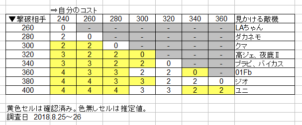 コスト差ボーナスについて、だいたい合ってるだろう表ができたので展開。