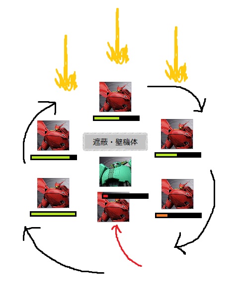 ナイチンゲールの短射程、高耐久って特徴を活かせる戦術がないか考えたんだけどどう?デブ車懸の陣。流れに乗るだけで被弾を散らしつつ火力維持できて、弱ったらすぐ回復もできるよ!