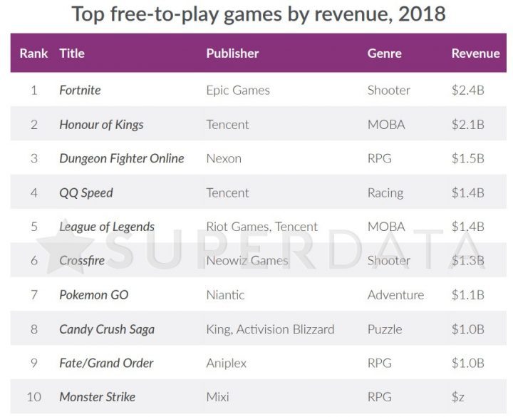 2018年の基本無料ゲー売上ランキング(フォートナイト$2.4B→24憶ドル)。TPSゲームはアバター売れるんだからガンオンもいけるいける