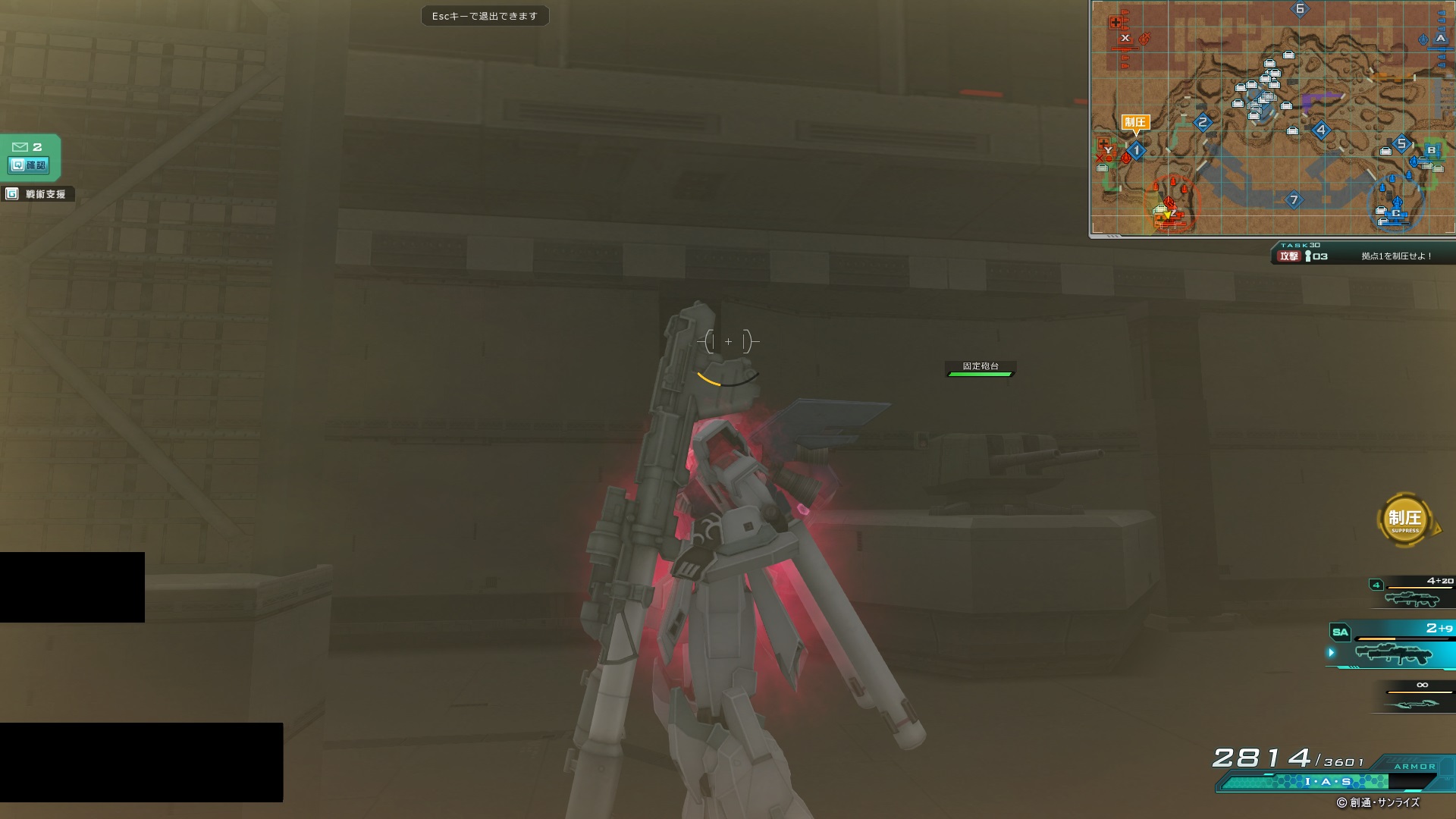 自爆ギリギリしない距離がこのくらいみたいだ。キーちょい押しで半歩踏み出したら自爆する。シナンジュの範囲無強化ロケバズは同じ場所で機体1機分後ろに下がった位置からでも自爆する