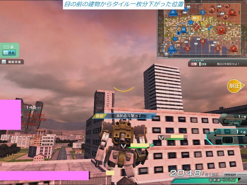 モジュール投擲3と起爆時間γ。オプション描画で視野角3。立ち位置の基準は機体の足のつま先。狙いそのままで建物の影に隠れるよう横に動き直しても問題なし。グレネイドを持ちすぎて起爆時間をロスしないよう注意されたし。