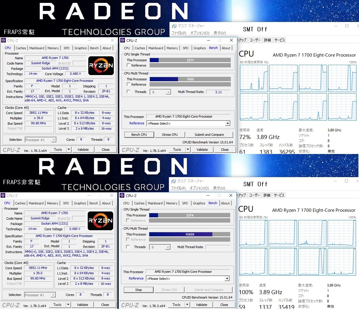 SMT有りで電圧を盛らずに常用できるのは「3.75GHz」でした。SMT無しで3.9GHz駆動時のFRAPS有無バックデータになります。この後4GHzで動かす予定があるので電圧は1.4Vまで盛っています。物理8コア4GHzでガンオンは会敵に動けるのか検証準備中。