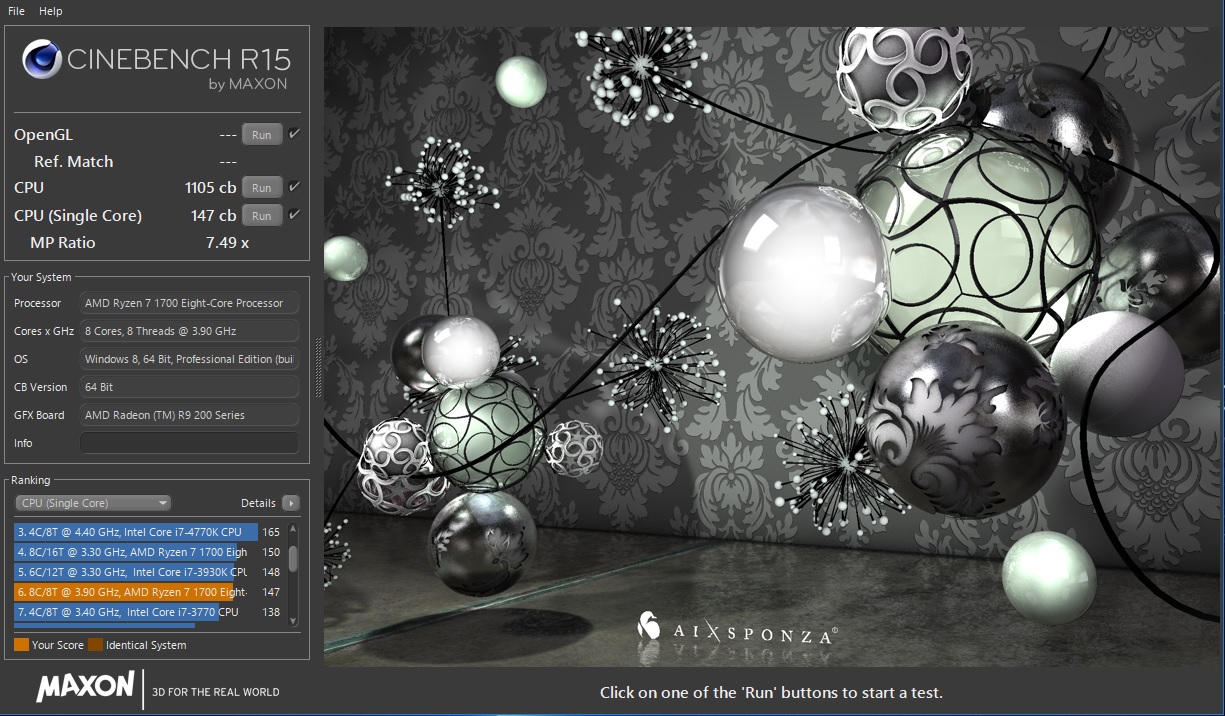 Chinebench R15の結果(Ryzen7 1700@3.9GHz) Single 147 Multi 1105