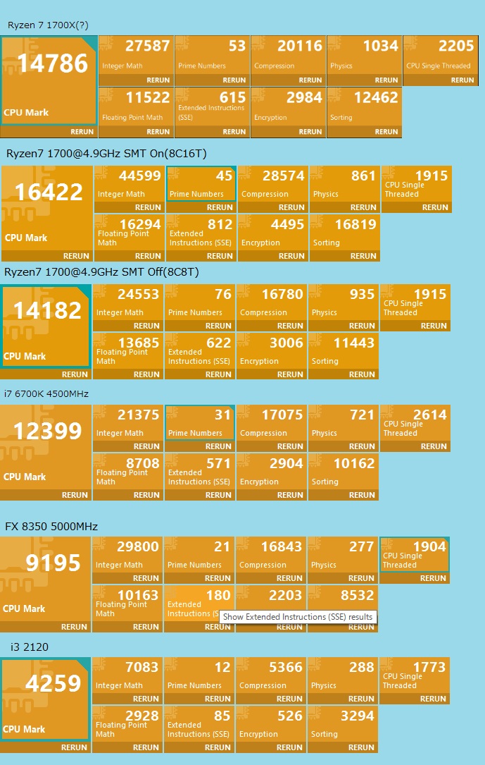 1700Xリーク時のPerformanceTest9結果にRyzen7 1700@3.9GHzを追加してみました。データが随分と違う・・・8C16Tと8C8Tにも差がある。これがWindows10のバグか。