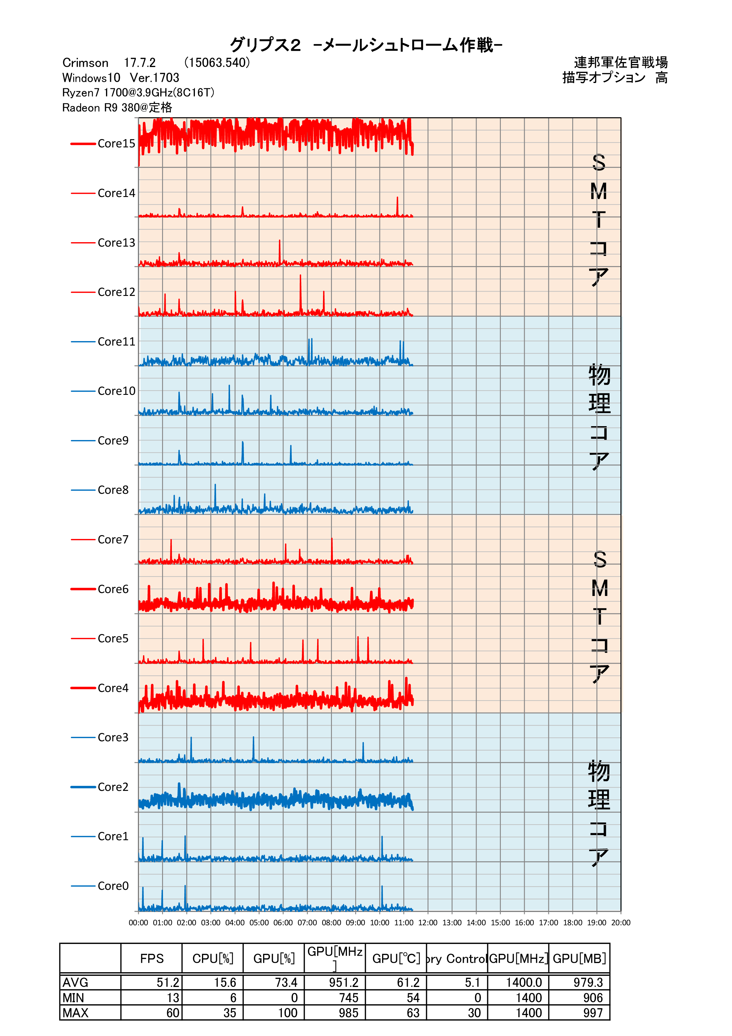 物理コアを1つにSMTコアを3つを使用している。SMTコアの15番がメインスレッドに割り当てられている。このCore15の動きとFPSが連動している?
