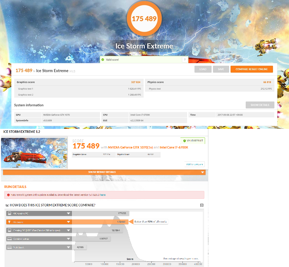 わざわざ有難うございます。6700k+1070でこんな感じなのか。軽いから380でも1070でも980でも同じくらいのスコアなのかもしれませんね。FX8350+270だと「116569」でした。もう一度取り直してみます。