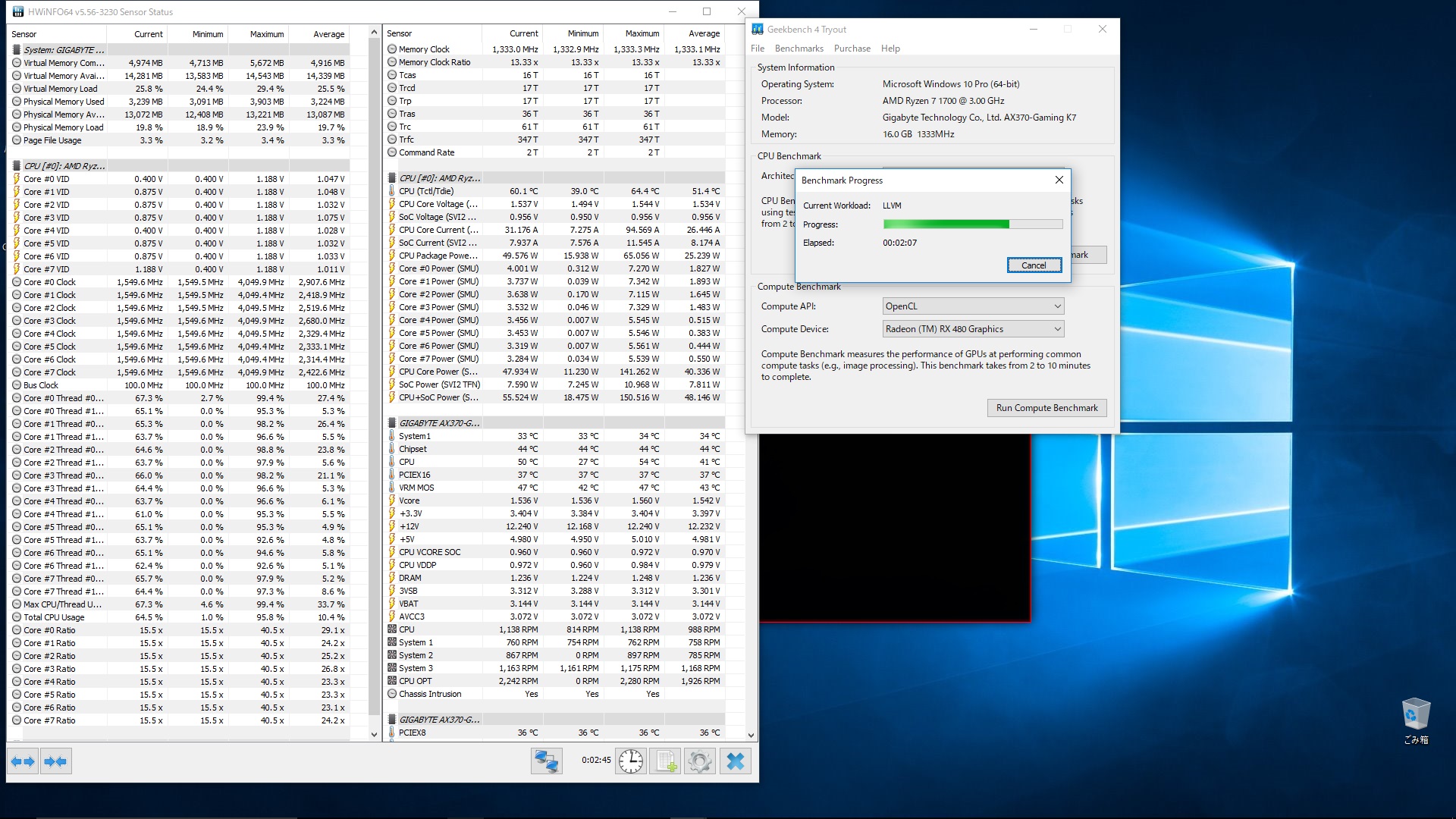 Geekbench軽すぎる・・・使用率も上がらないしクロックも1.5GHzで廻る、偶に4GHz超えるくらい。このベンチコアが少ない方がスコア出るんじゃないか?