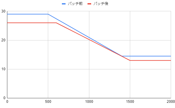 距離が伸びても拡散するから意味ない云々の意見がたまに見られるね。勘違いしてる人のために適当に書いたやつだけどパッチ前後の距離減衰グラフ置いておくよ。見てわかる通り減衰距離が伸びてもパッチ前のタイミングより威力が上がることは無いんだ。残念だね。