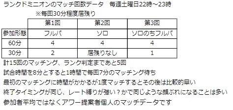 今週もありますランクドミニオンアワー。7/21 22時~23時。私のマッチデータをまとめました。試合時間は5分~15分ぐらいあるのであくまで平均です。