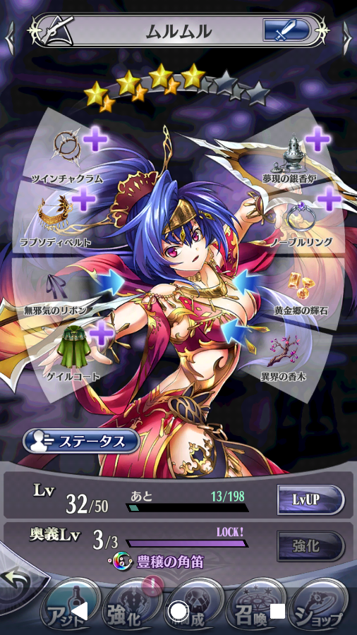 ツインチャクラム・ラプソディベルト・無邪気のリボン(月ブエル)・ゲイルコート・夢現の銀香炉・ノーブルリング・黄金郷の輝石・異界の香木