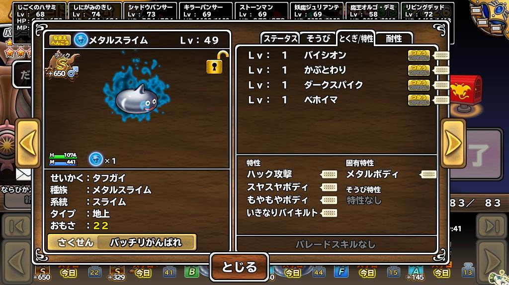 メタスラはDランの中でも入手難度が低いので良特性が付きやすいですよね。意外にもベホイマが役に立ってます。自己修復しながら粘ってくれる子です。