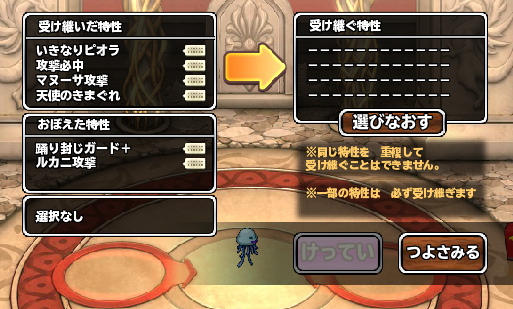 ありがとう (^^) さらにルカニ攻撃ひらめいて、うとうと 寝返り 必中 残すとなると 最後ひとつをどうするか悩んでます。。 マヒ攻撃もすぐに戻せるし。 木